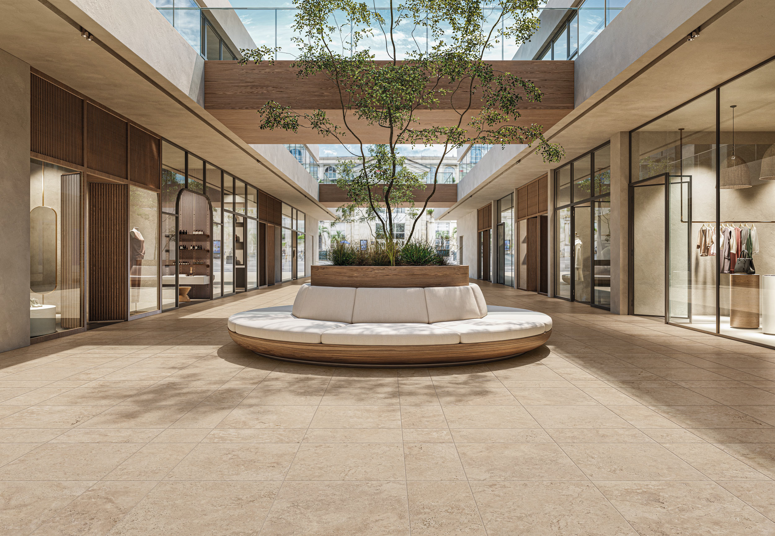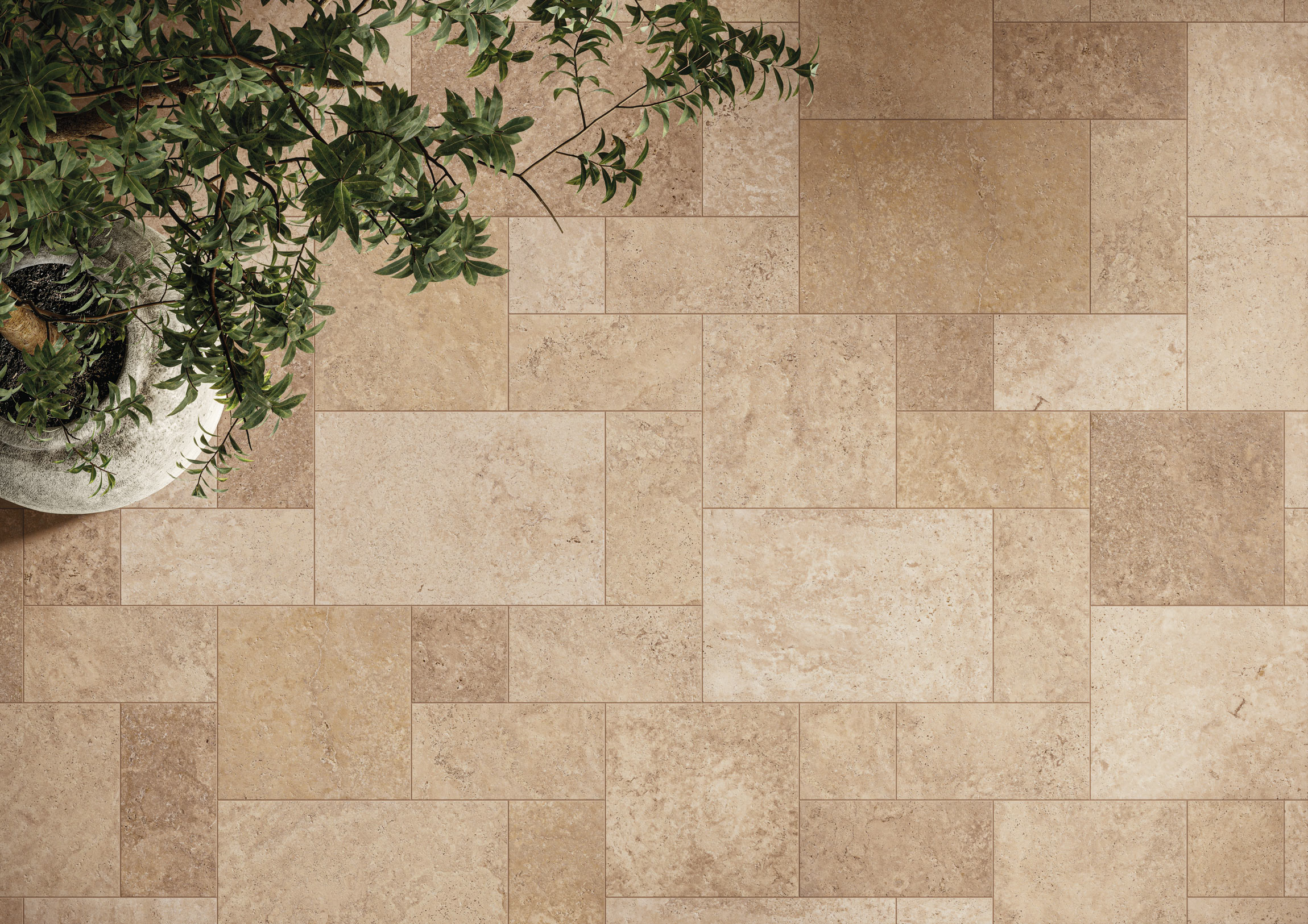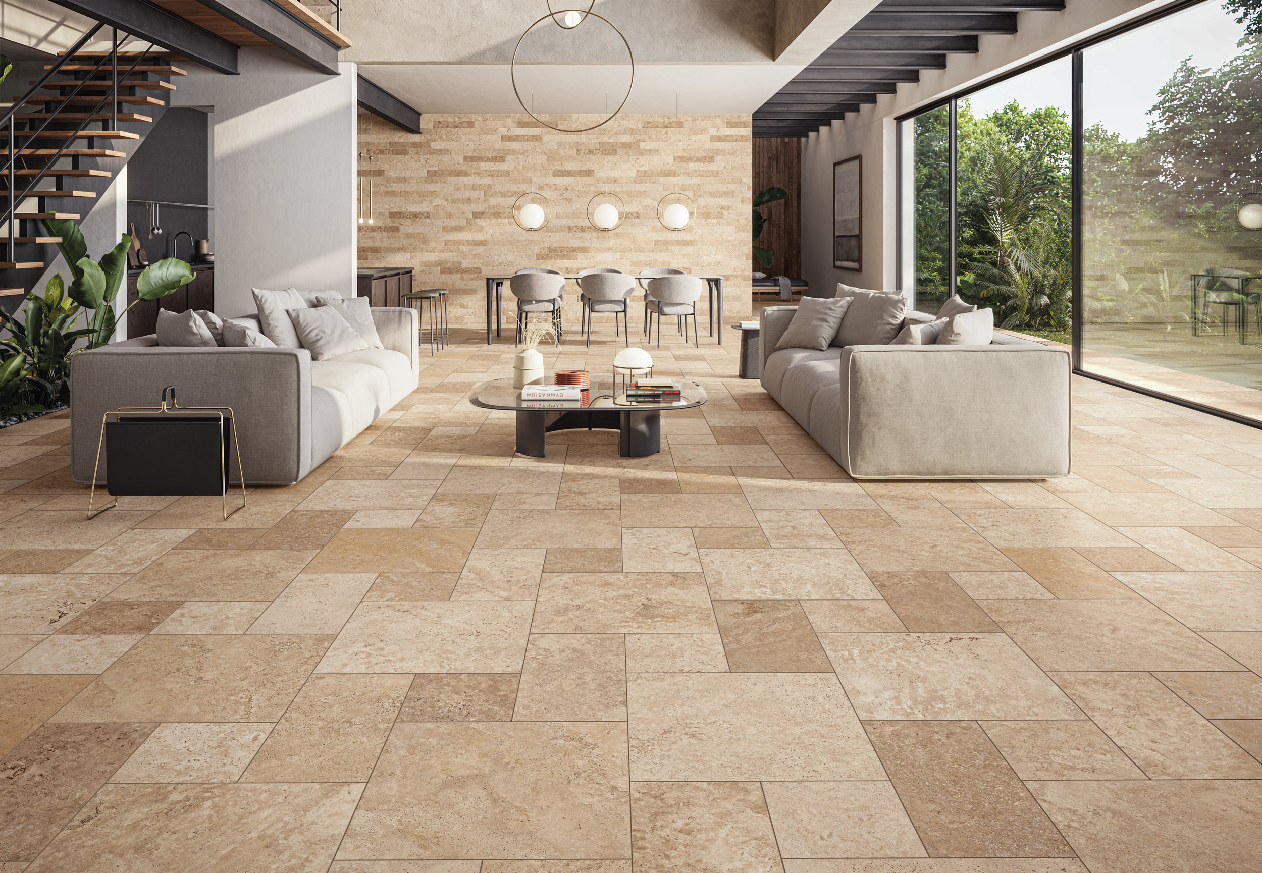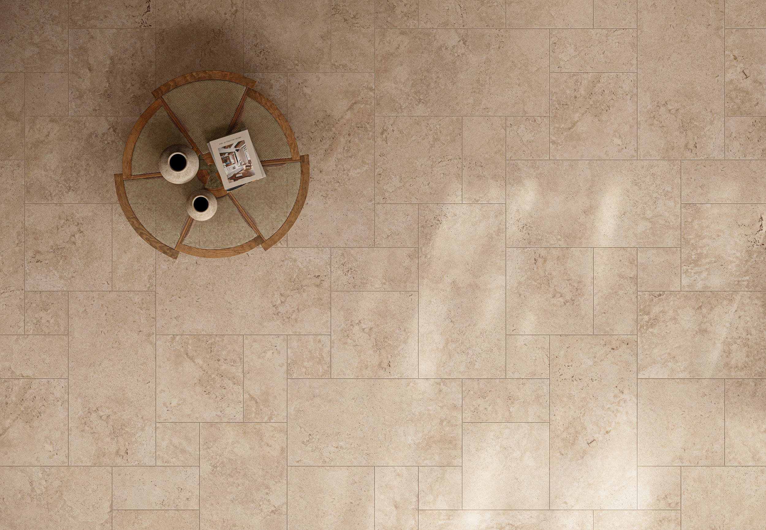 Tiber reproduziert originalgetreu die Beigetöne und Oberflächenunregelmäßigkeiten von Travertin in zwei Farbvarianten: Tiber Natural (mit den verschiedenen Farbtönen des Originalsteins) und Tiber Light (eine elegante Auswahl der hellsten und gleichmäßigsten Farbtöne).