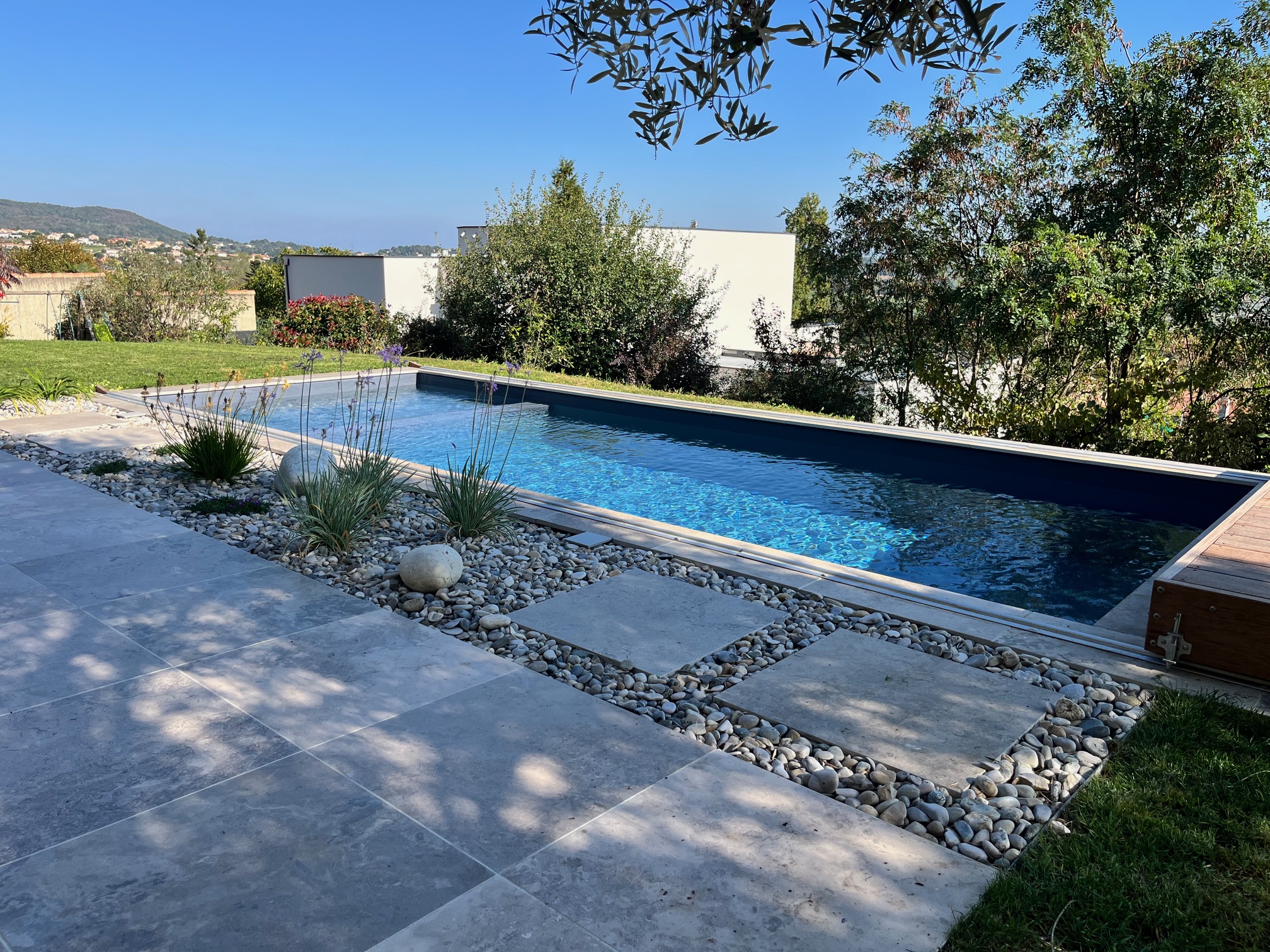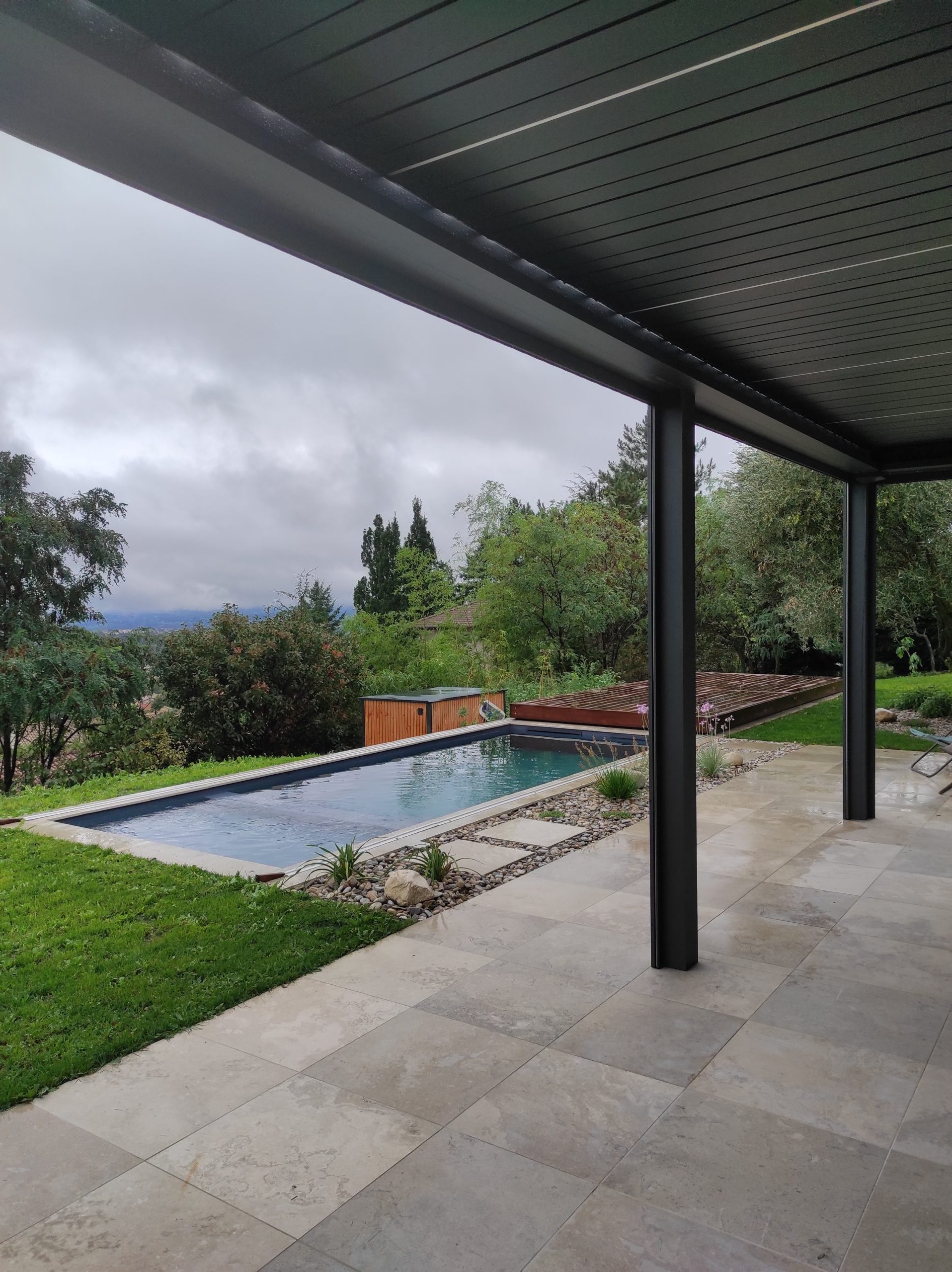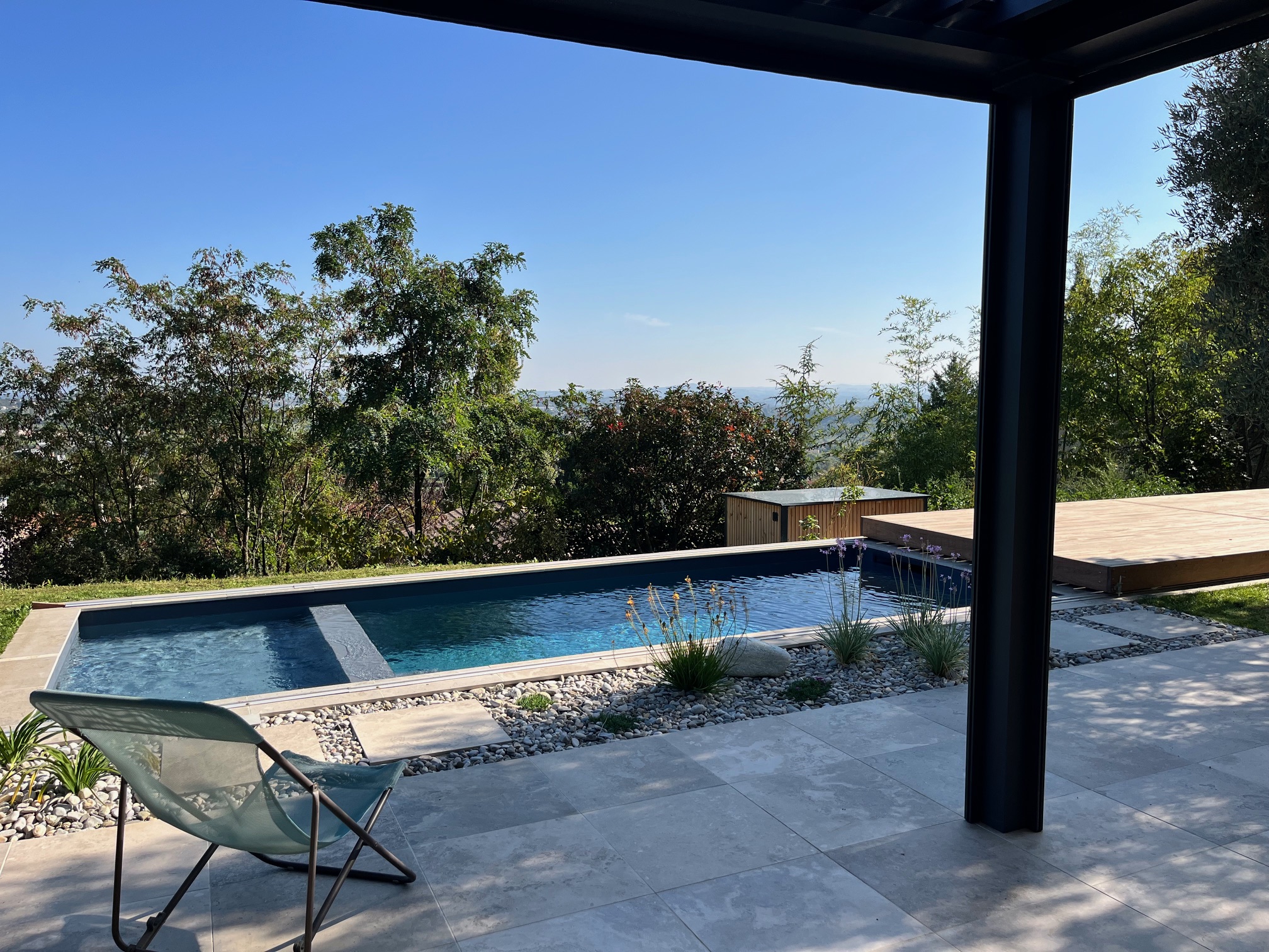 Die Terrasse, die von einer bioklimatischen Pergola beschattet wird, öffnet sich zu einem Swimmingpool, dessen Größe perfekt auf das Familienleben und die landschaftliche Umgebung abgestimmt ist.