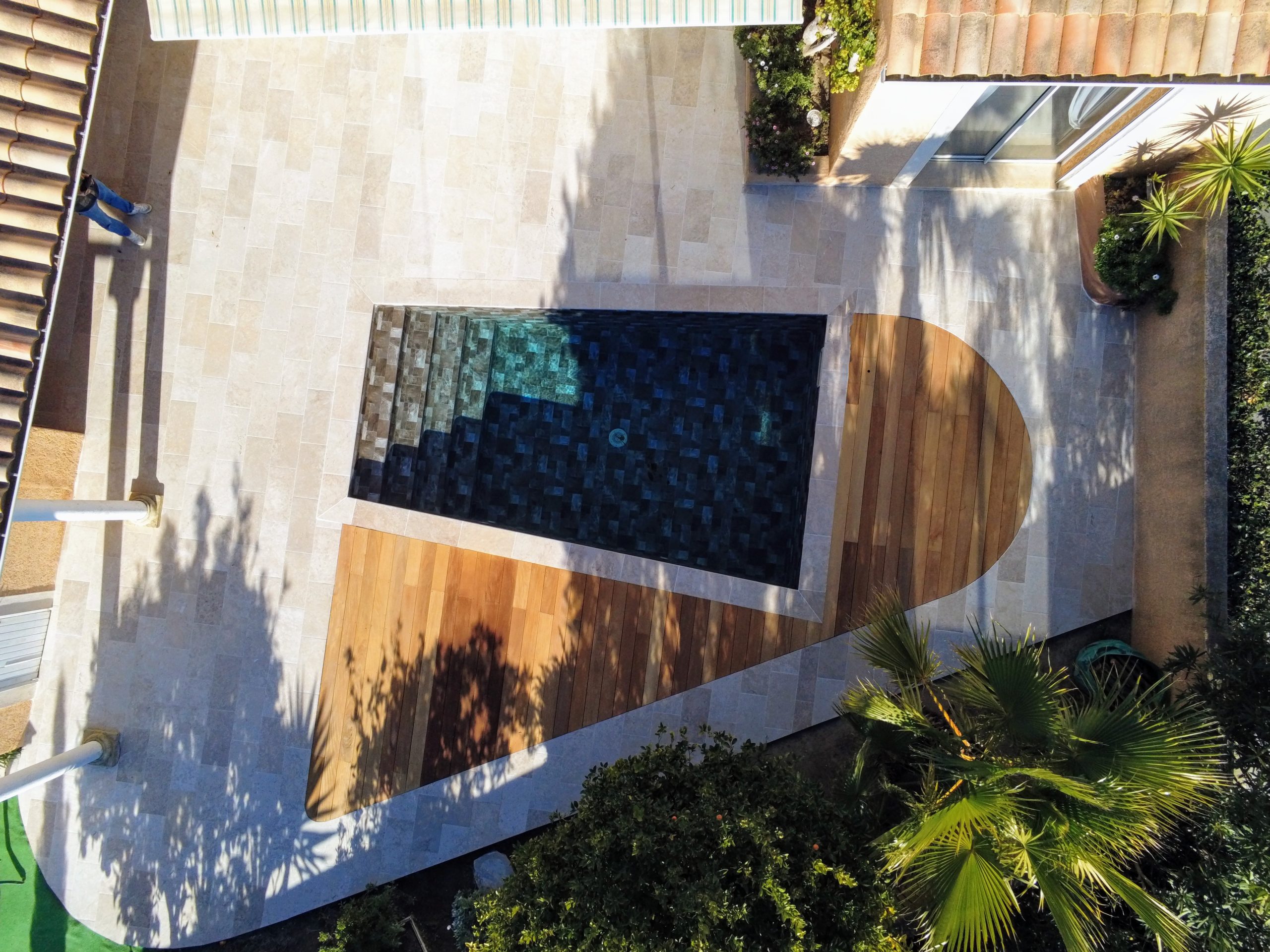 In dieser eleganten Villa in Südfrankreich wurden die Fliesen in Travertin-Optik aus der Kollektion Tiber gewählt, um die Umgebung des Pools und die angrenzende Terrasse zu veredeln. Dank ihrer sanften Nuancen und ihres authentischen Aussehens fügen sie sich harmonisch in die mediterrane Architektur des Hauses mit seinen traditionellen Ziegeldächern und den begrünten Außenbereichen ein. Dieses Projekt, das von der Firma Ametec realisiert wurde, hebt die Kombination von keramischem Travertin mit Holzakzenten und einem Pool in dunklen Farbtönen hervor, um ein anspruchsvolles und einladendes Ergebnis zu erzielen, das sowohl zum Entspannen als auch für geselliges Beisammensein ideal ist.