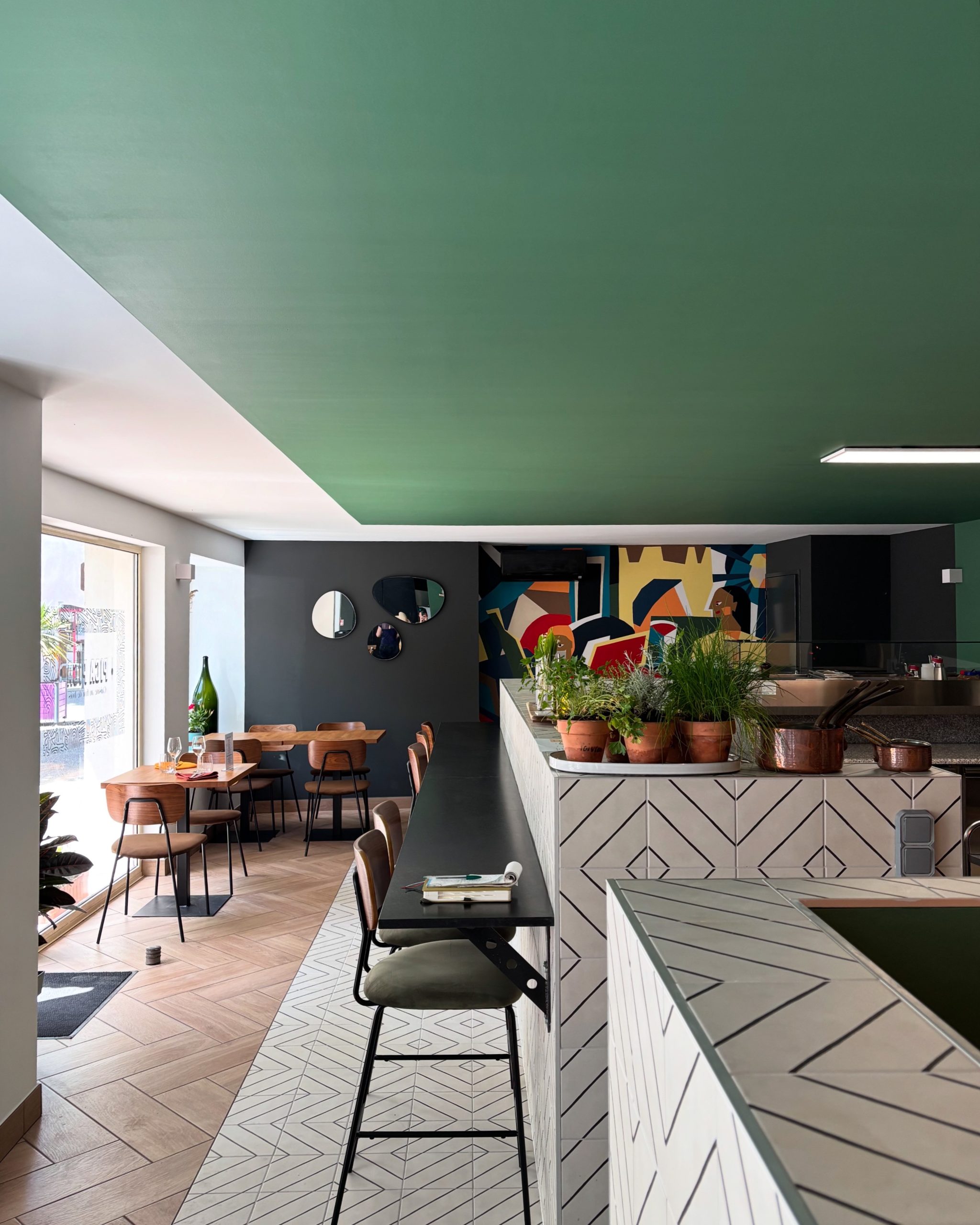 Die Kollektion Bohème von Novoceram wurde auf einem Teil des Bodens sowie auf den Flächen der Bar und der Küche verwendet. Ihre dekorative Ästhetik, inspiriert von Zementfliesen, ermöglicht es, den Räumen Rhythmus zu verleihen und unterschiedliche Bereiche innerhalb des Lokals zu schaffen.