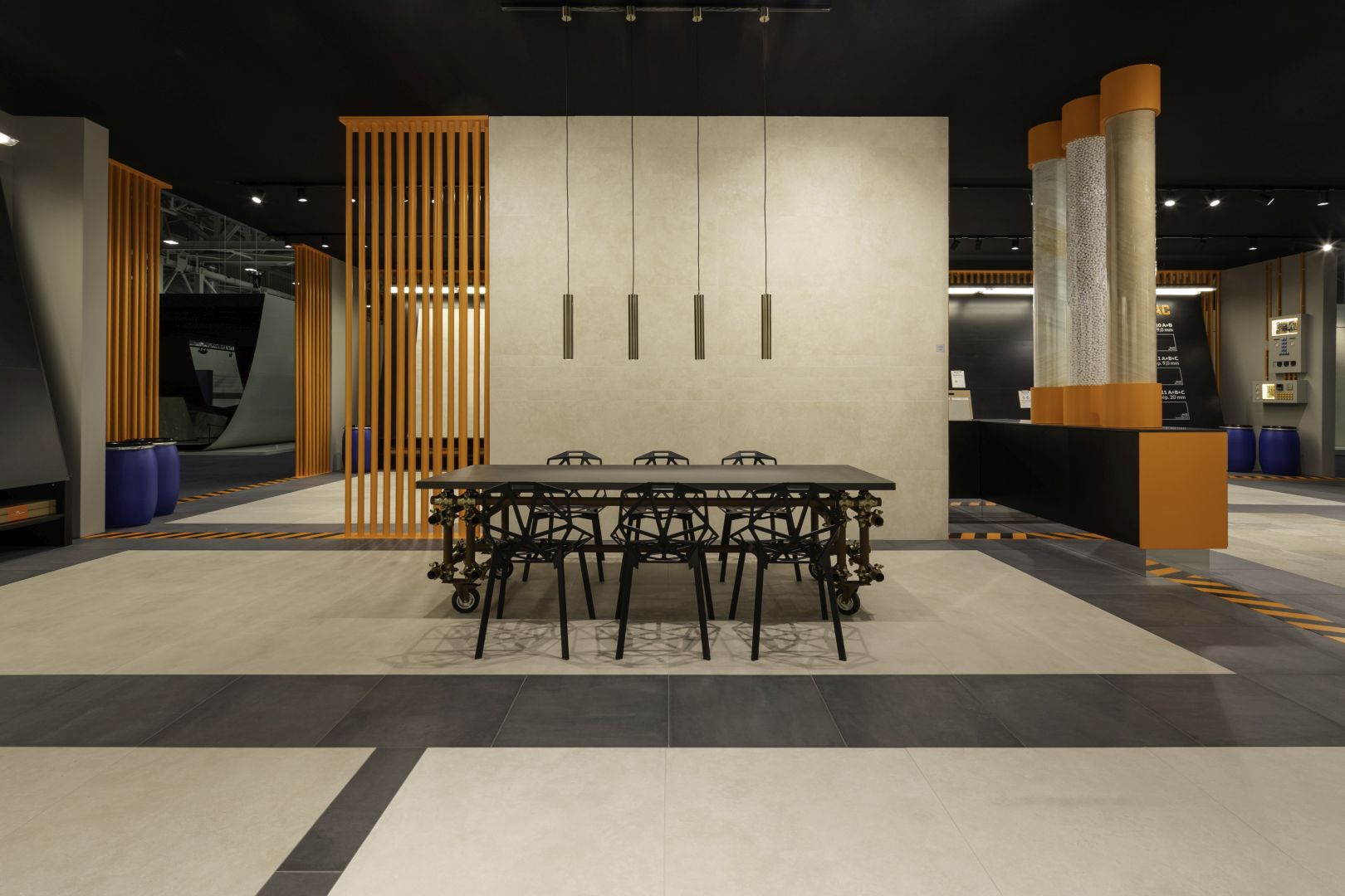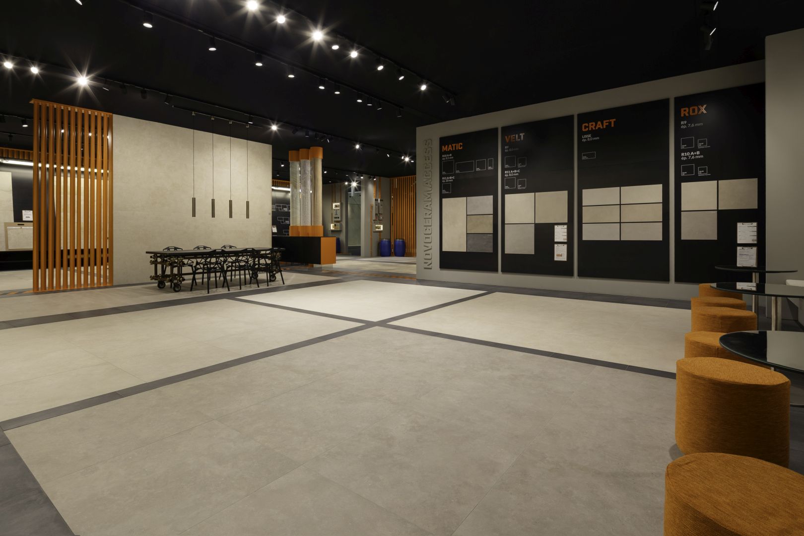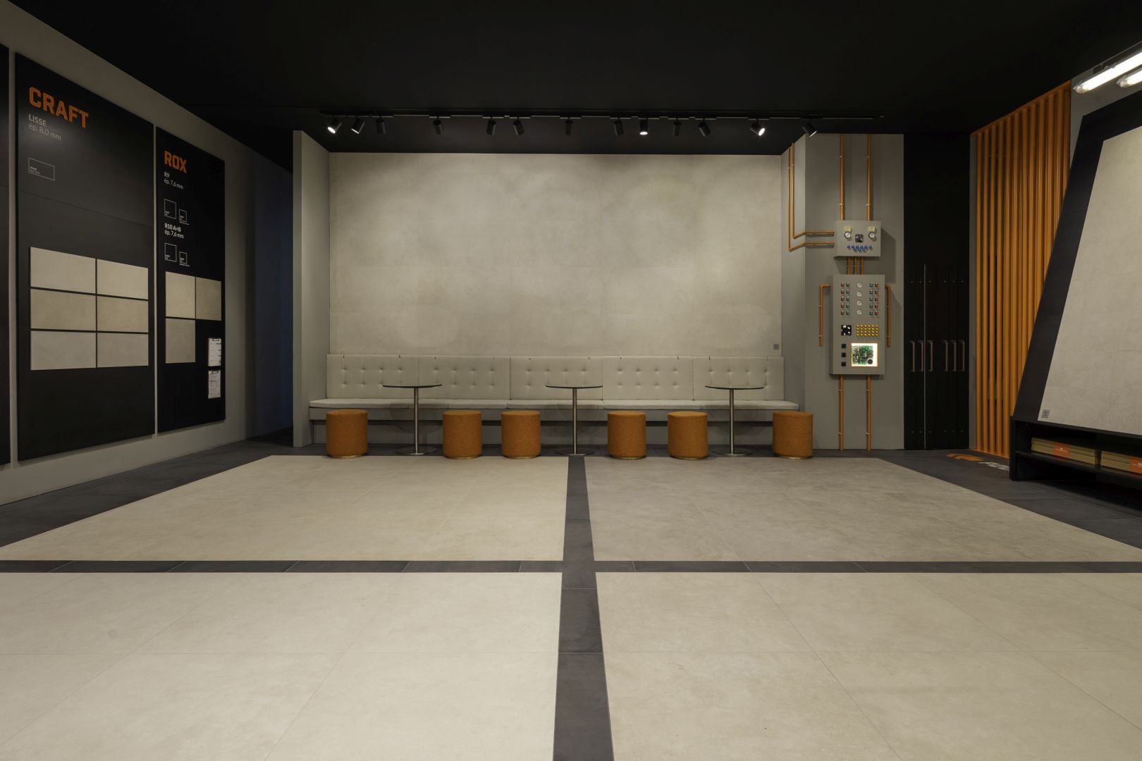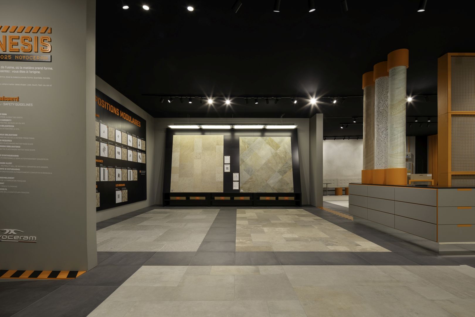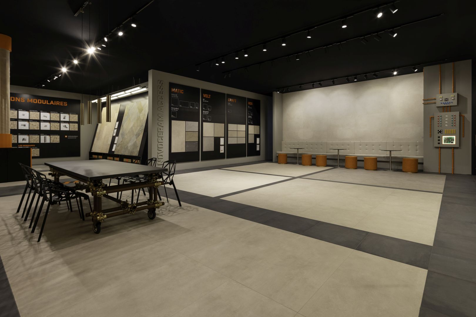 Zwischen industriellen Linien, Werkstattelementen und Anspielungen auf das keramische Know-how präsentiert sich der Raum wie eine neu erfundene Fabrik. Hier ist jede ausgestellte Fliese nicht nur ein fertiges Produkt, sondern Zeuge eines Prozesses: einer geduldigen, präzisen und leidenschaftlichen Verwandlung.