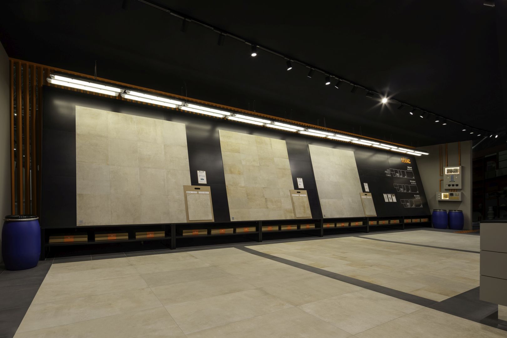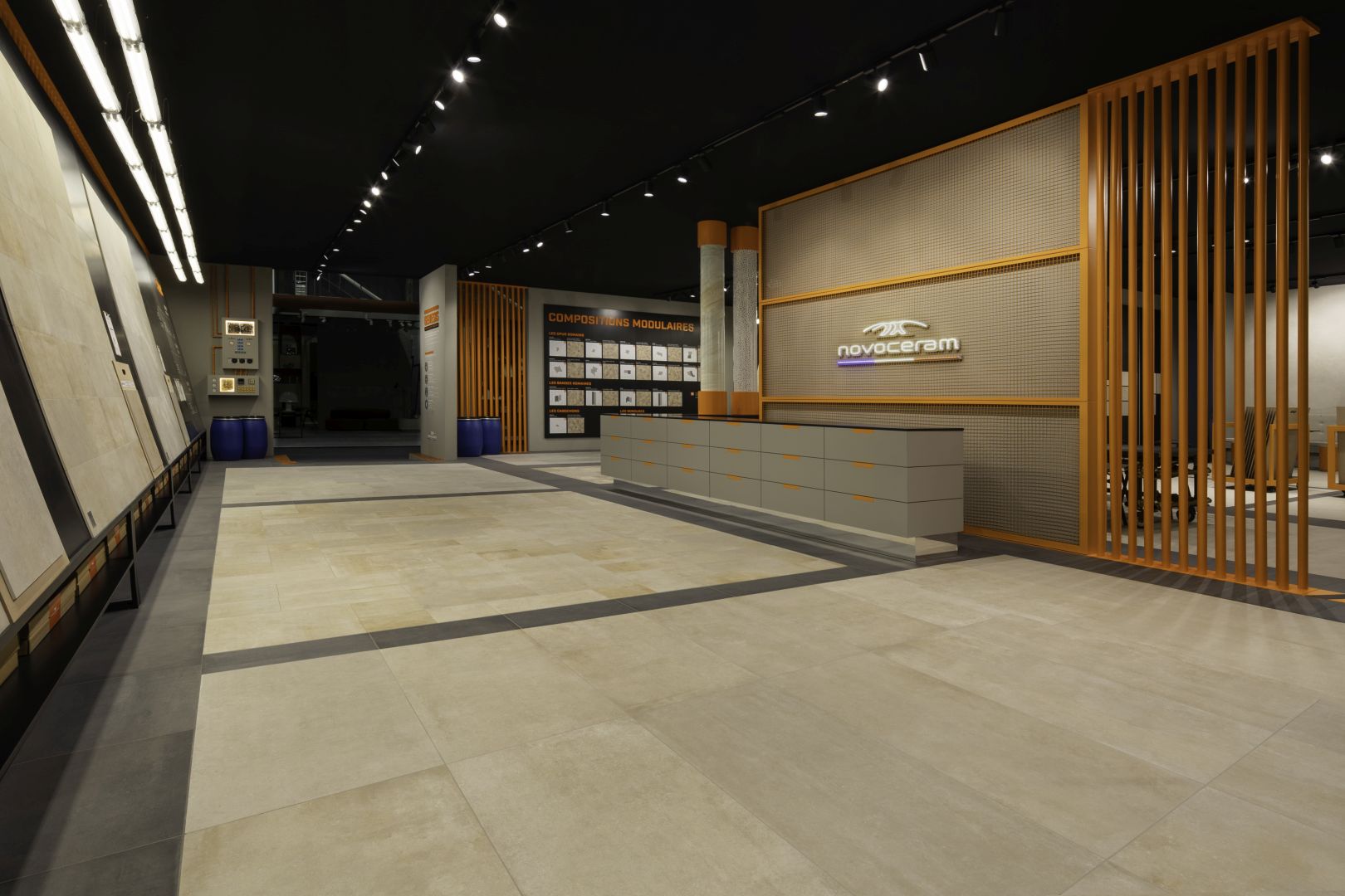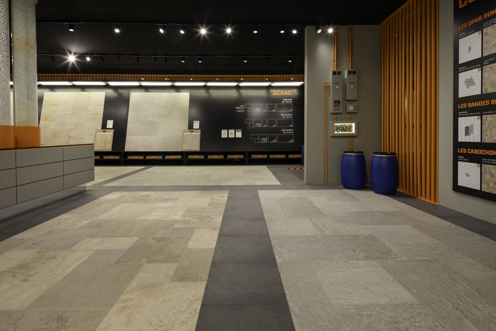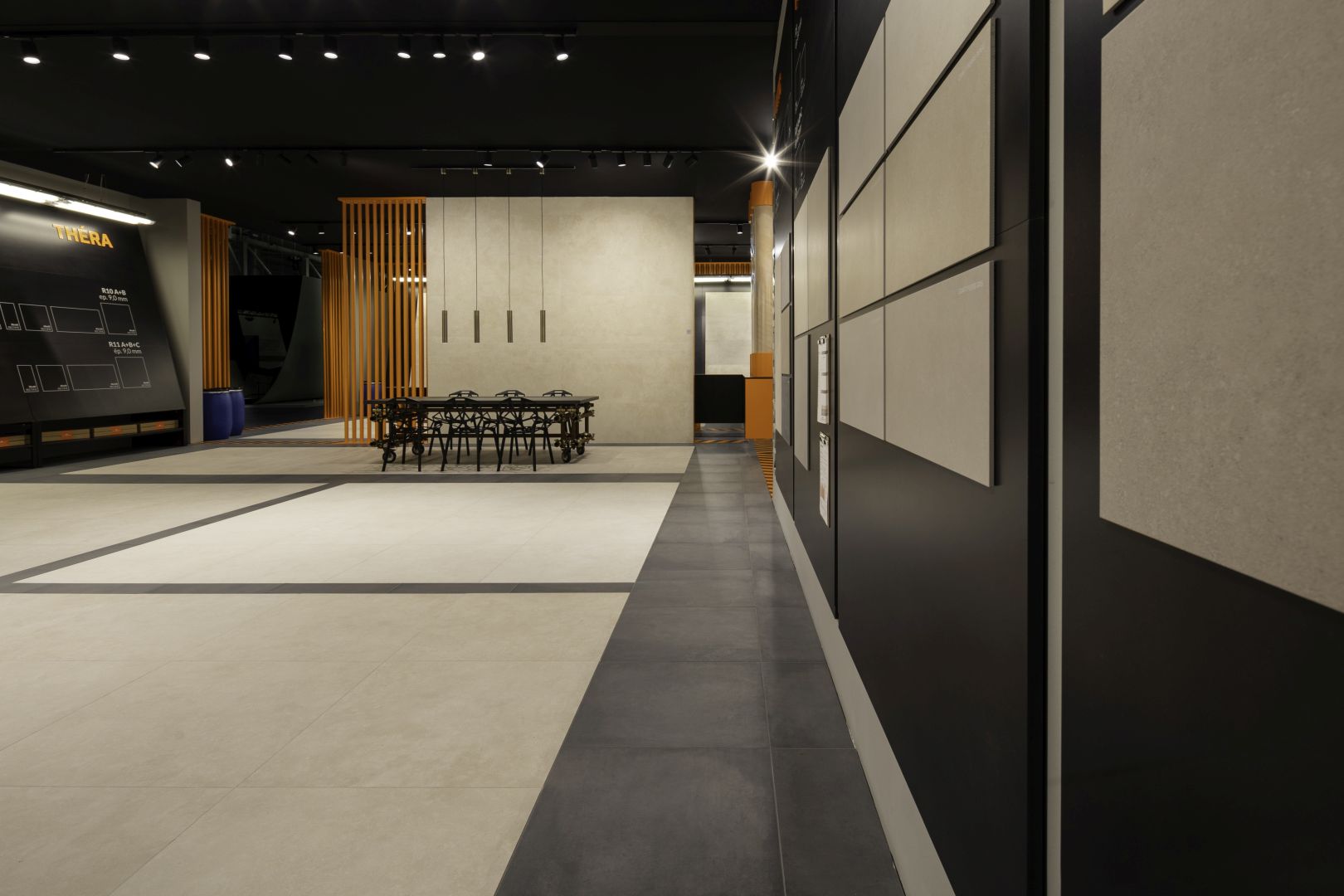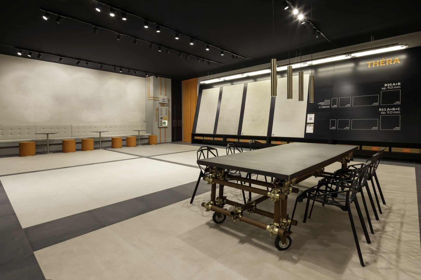 Zwischen industriellen Linien, Werkstattelementen und Anspielungen auf das keramische Know-how präsentiert sich der Raum wie eine neu erfundene Fabrik. Hier ist jede ausgestellte Fliese nicht nur ein fertiges Produkt, sondern Zeuge eines Prozesses: einer geduldigen, präzisen und leidenschaftlichen Verwandlung.