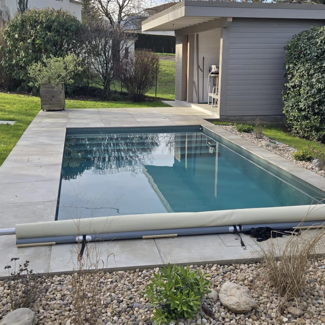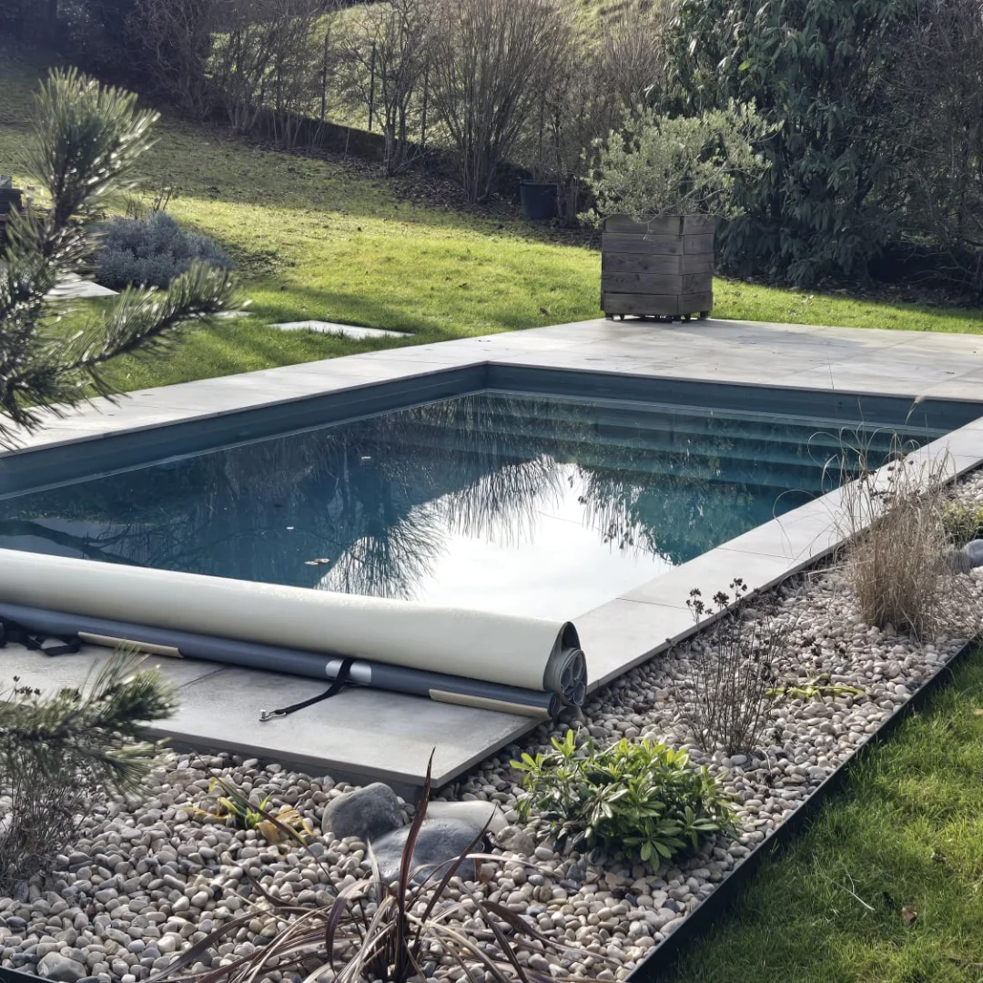 Für alle Flächen rund um das Becken fiel die Wahl auf die Kollektion Château von Novoceram. Ihre Ästhetik, die von einer Mischung aus Stein und Beton inspiriert ist, fügt sich harmonisch in die Außenumgebung ein und trägt zur Strukturierung der verschiedenen Bereiche bei.