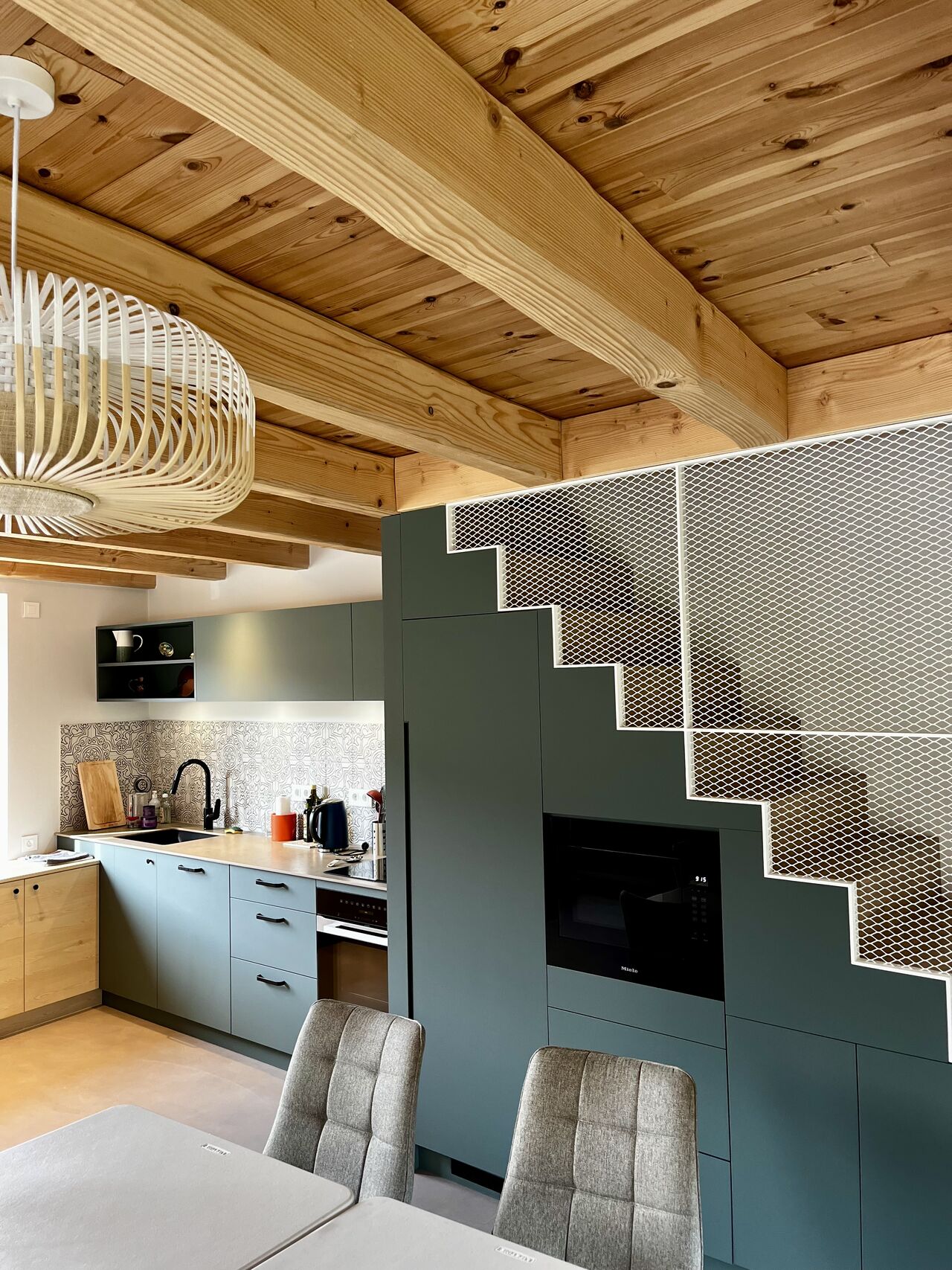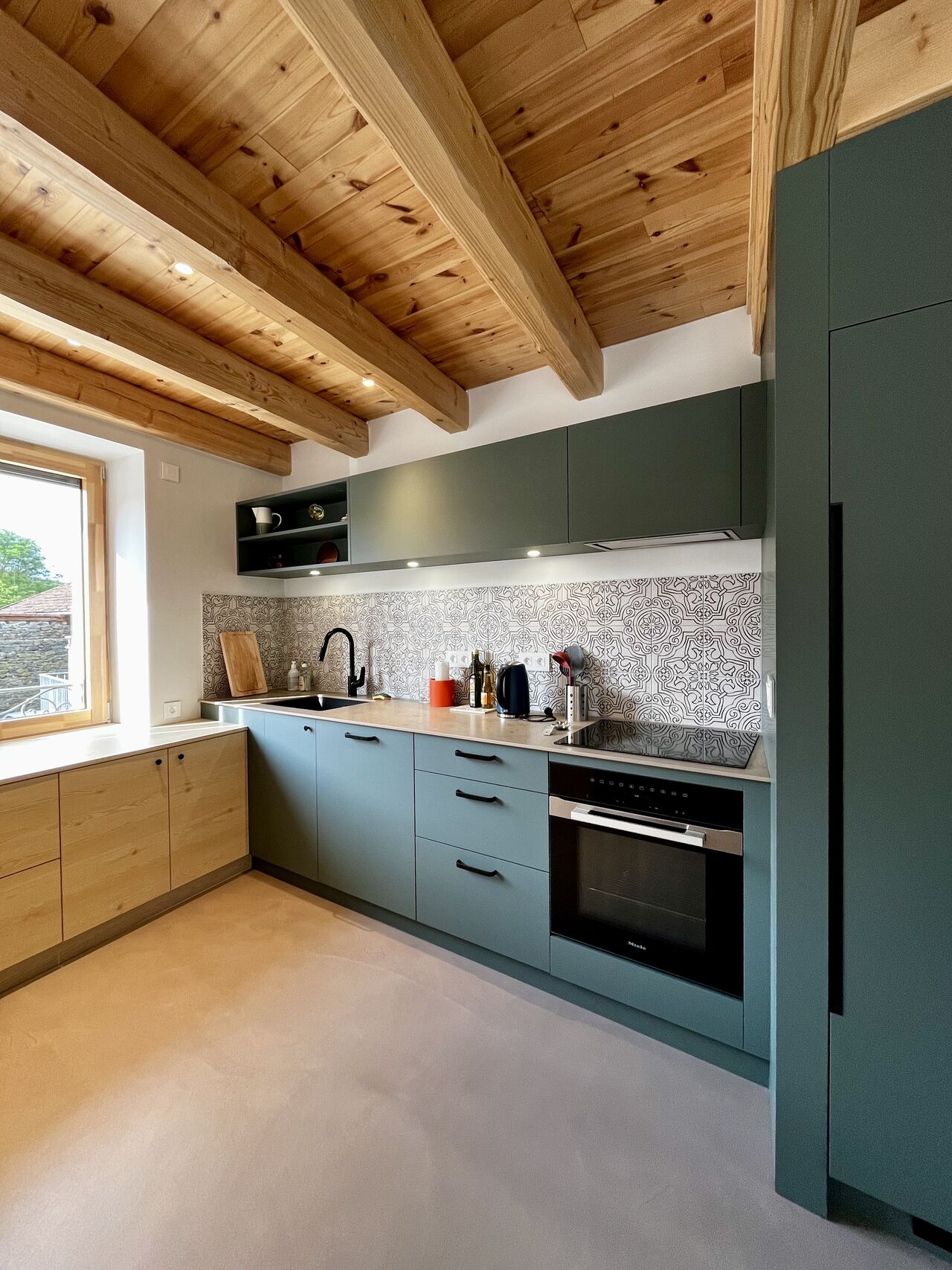 Bei dieser von Chloé Bourdelain gestalteten Renovierung verbindet die Küche Authentizität und Modernität in einer gemütlichen und eleganten Atmosphäre.