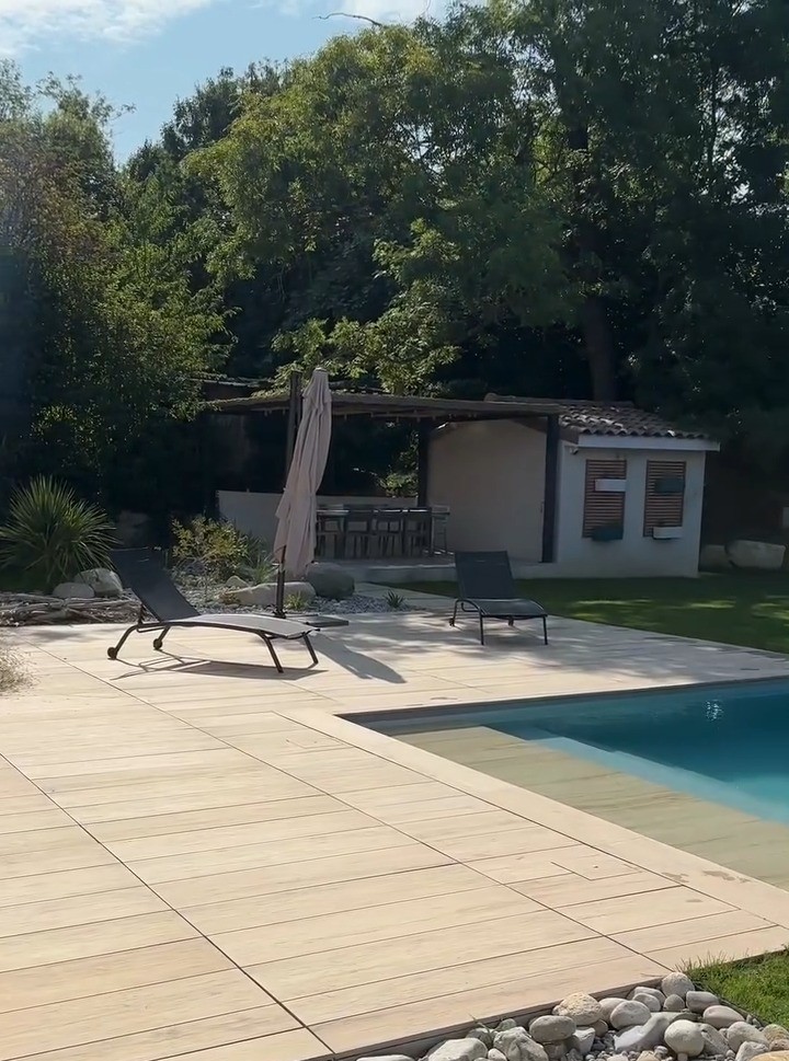 Der Poolbereich ist mit der Abéa-Kollektion von Novoceram verkleidet, einer Fliese in Holzoptik, die dem gesamten Projekt eine warme und natürliche Ästhetik verleiht. Diese Wahl ermöglicht eine harmonische Integration des Poolbereichs in die landschaftliche Umgebung.