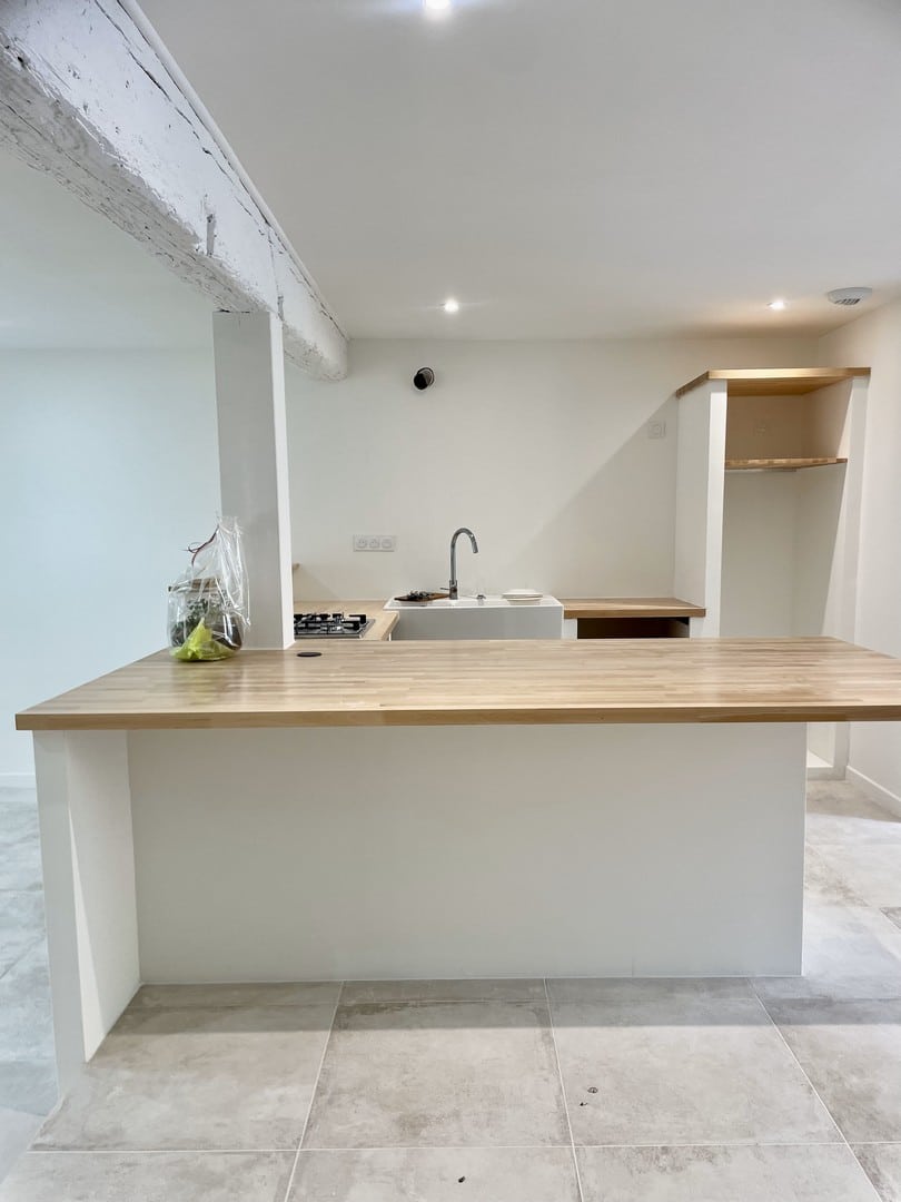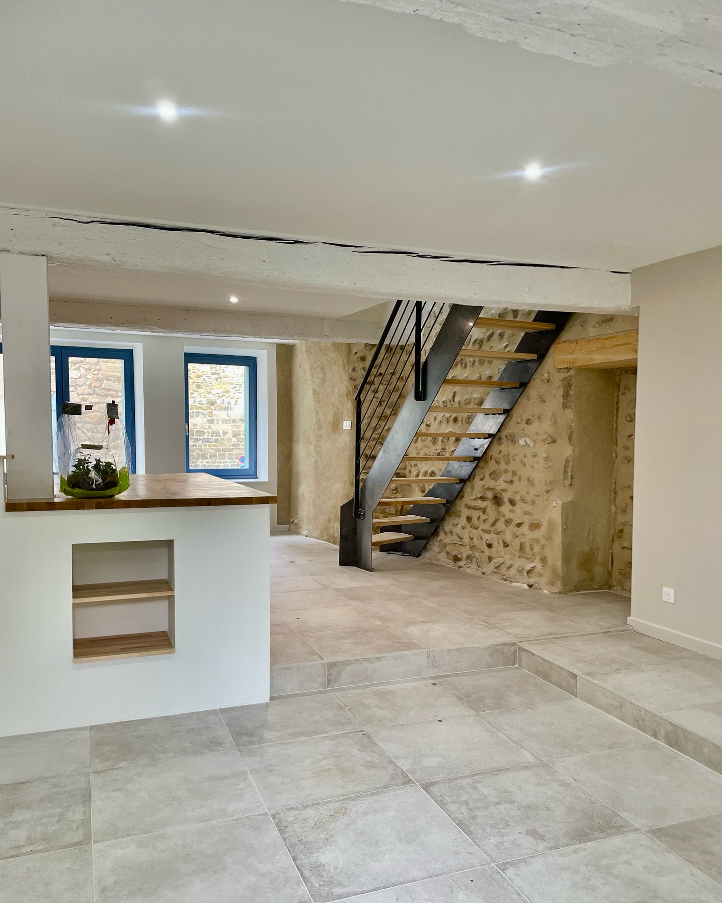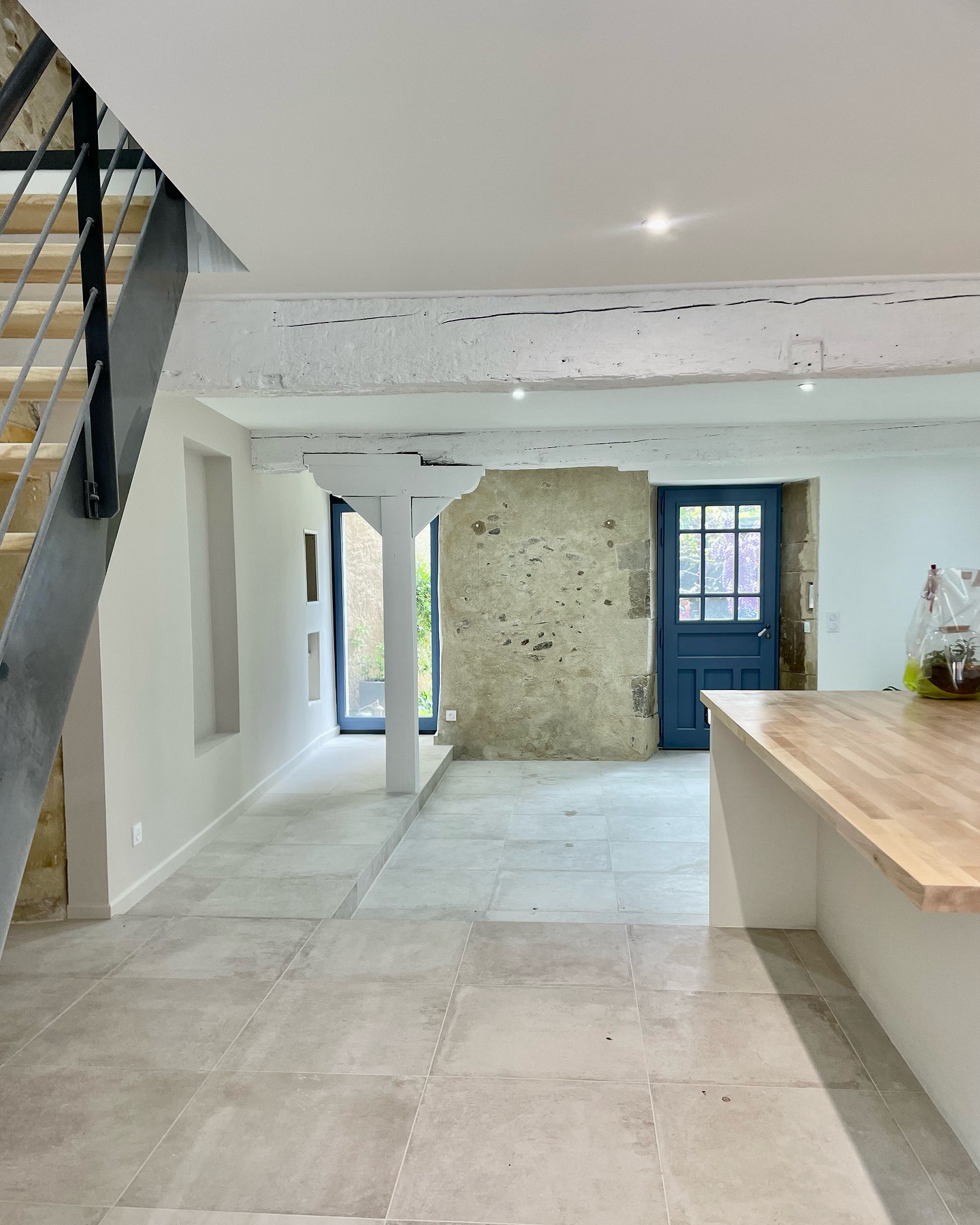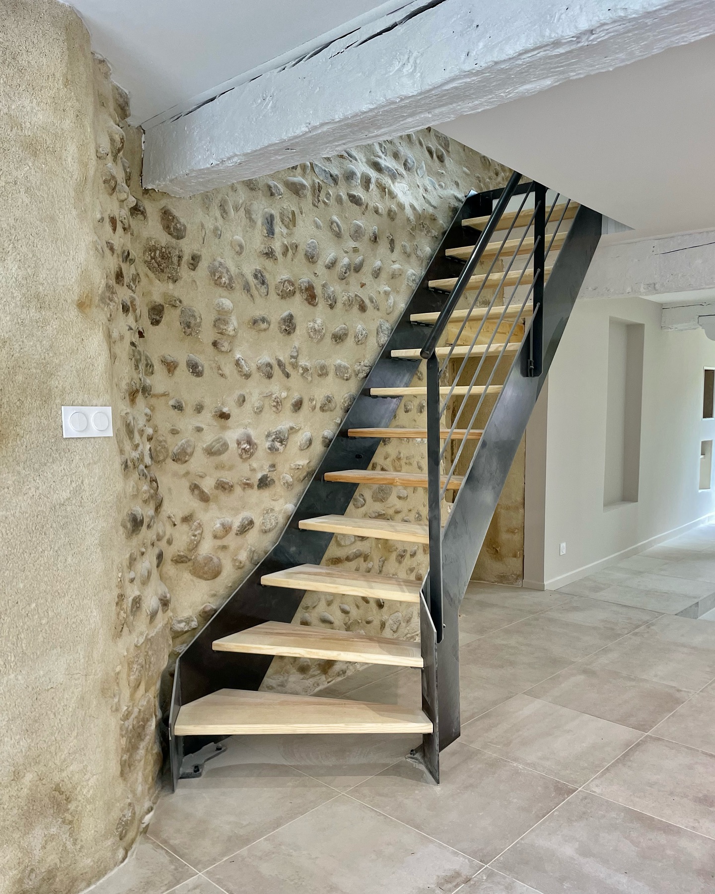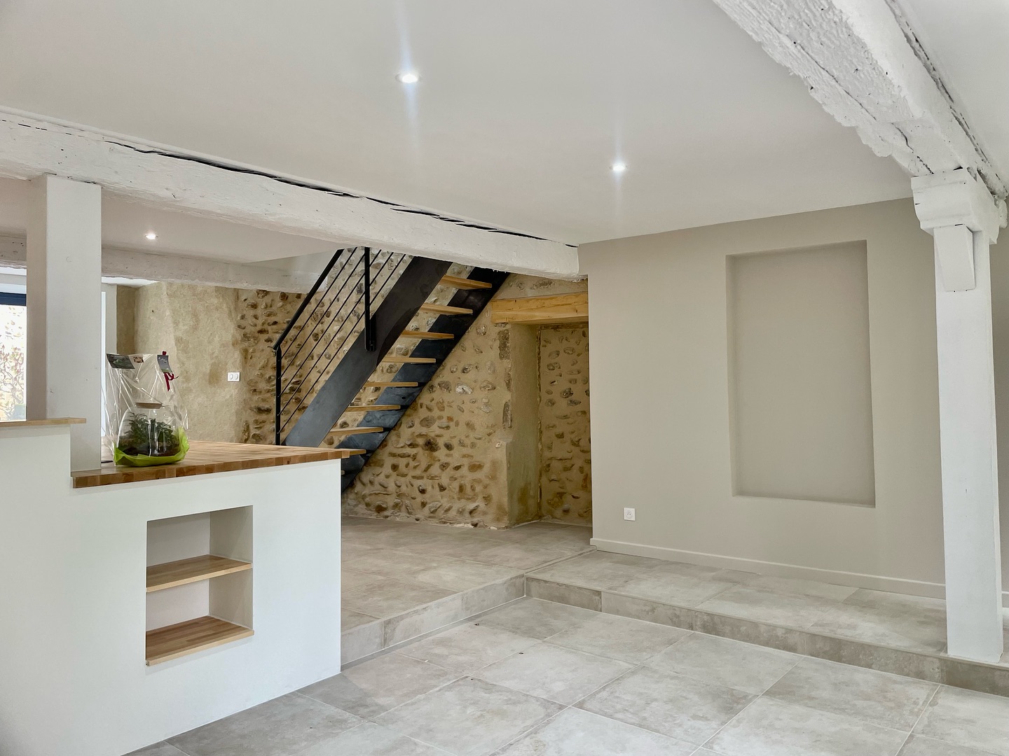 Im Erdgeschoss wurde der Boden mit der Kollektion Château Gris von Novoceram verkleidet. Seine Ästhetik, die von alten Steinen inspiriert ist, fügt sich natürlich in das Bestehende ein und unterstreicht die Authentizität des Ortes.