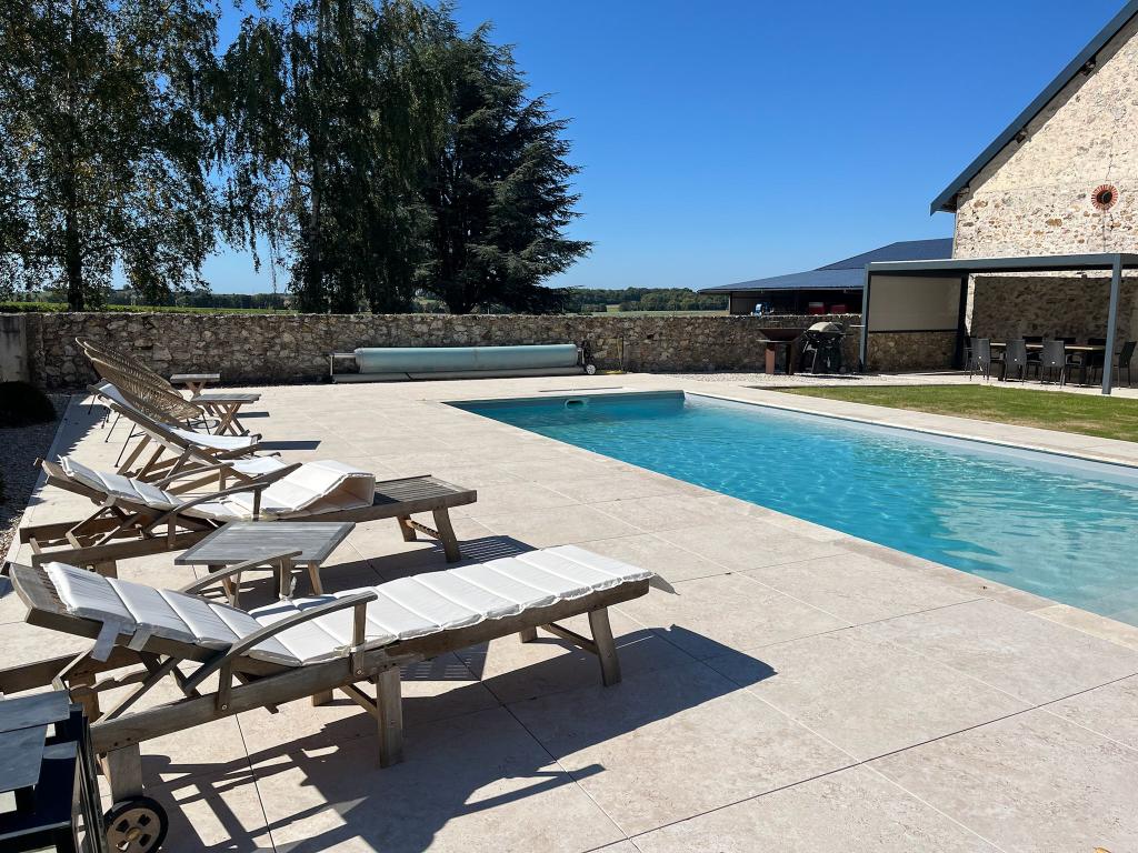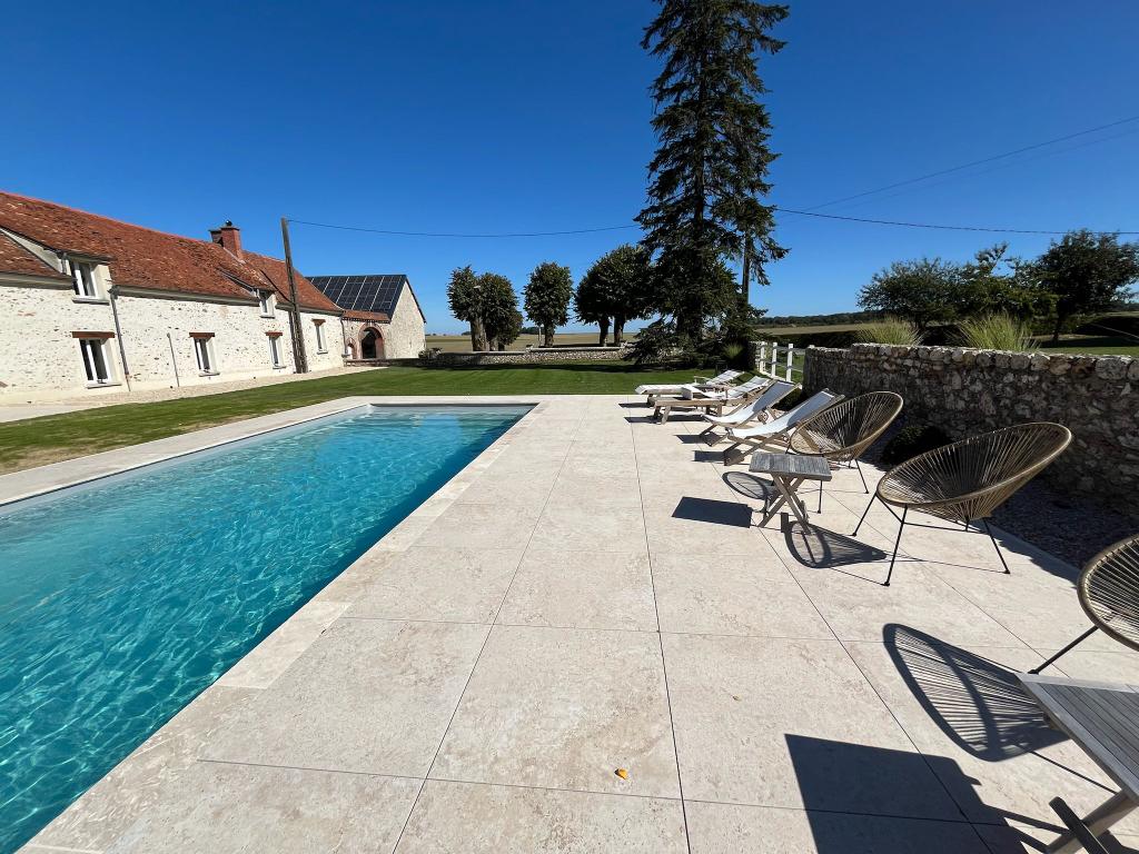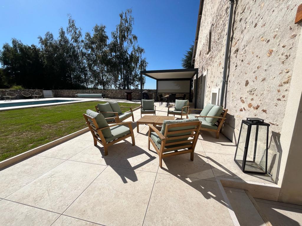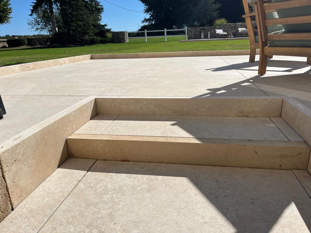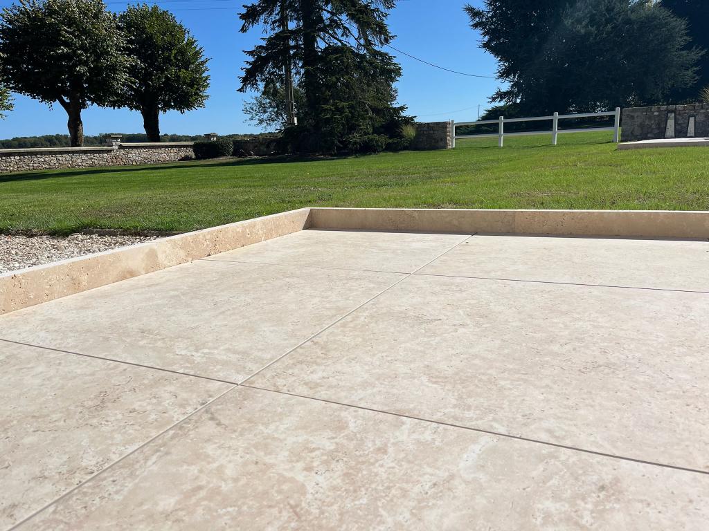 Für die gesamte Terrasse fiel die Wahl auf die Kollektion Tiber Light von Novoceram, deren Travertinoptik eine sanfte und natürliche mineralische Ästhetik vermittelt. Die Fliesen strukturieren den Raum um das Becken und sorgen für eine harmonische optische Kontinuität mit der landschaftlichen Umgebung.